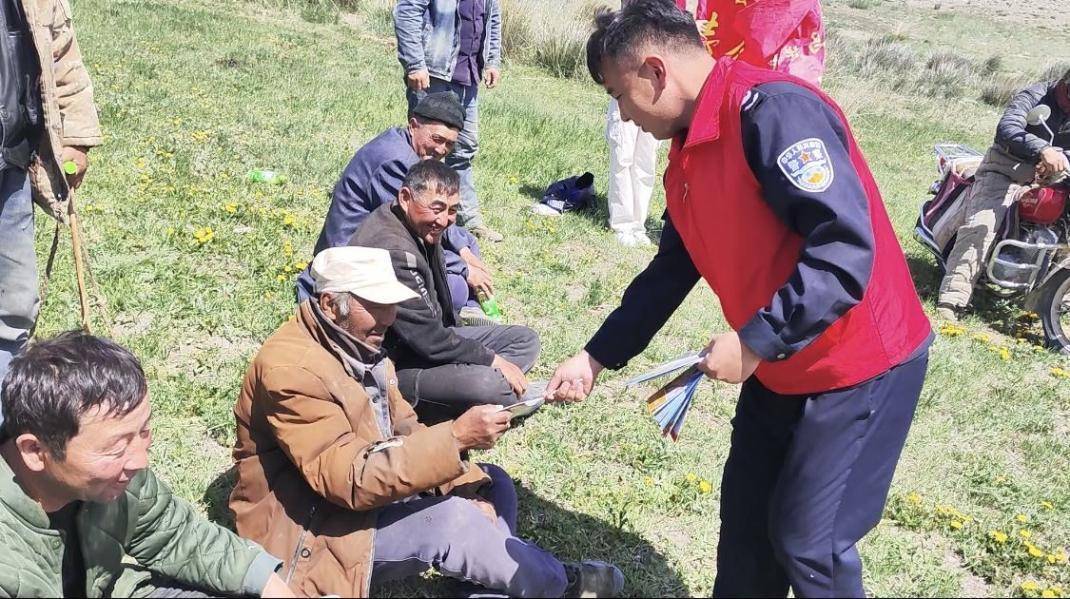 马背宣讲队队员为牧民发放宣传手册。受访者供图